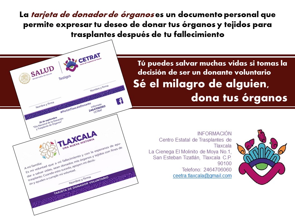 El Centro Estatal de Trasplantes de Tlaxcala es el organismo responsable de coordinar, regular y fortalecer las acciones de donación y trasplante de órganos y tejidos con fines terapéuticos en el estado, en apego a la normatividad vigente y a los principios éticos, legales y científicos que rigen esta actividad.